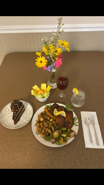This dinner menu included: Seasoned Blackened Tilapia served with Fresh Rosemary-Garlic Potatoes, Roasted Brussels Sprouts with Mushrooms, Chilled Fresh Fruit Cup, and Peanut Butter-Chocolate Lava Cake. Drink: Sparkling Cranberry Cocktail